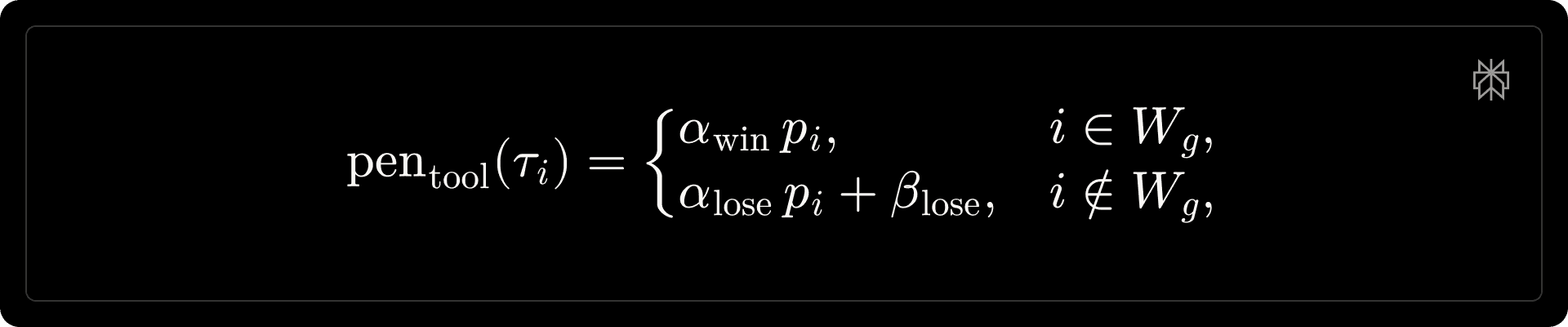 In the absence of explicit efficiency shaping, the policy tends to overuse tools even on simple prompts. Unconditional penalties (e.g., those scaling linearly with tool-call count or output length) are a natural baseline, but we find they suppress necessary exploration and degrade learning. We therefore adopt group-relative, anchored penalties that regularize tool usage and response length relative to effective solutions within each GRPO group. For a group 𝑔, we define the winner set as: