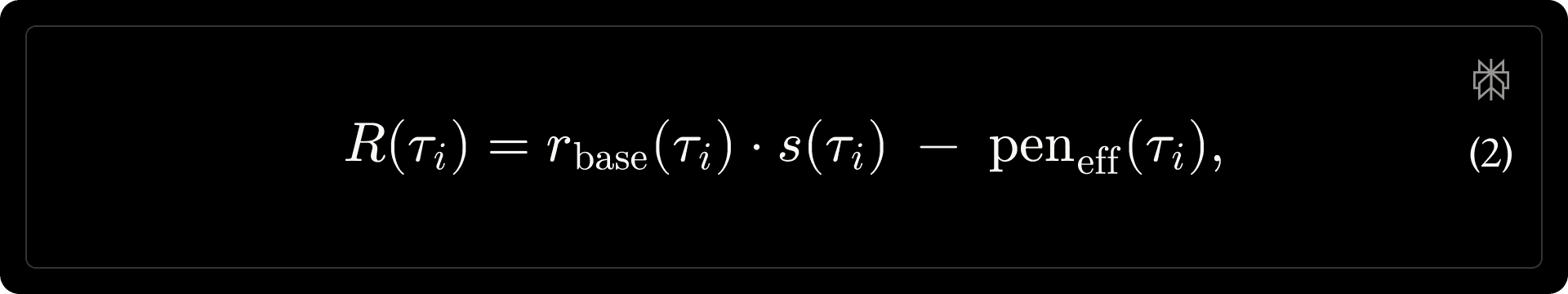 where [math]r_{\mathrm{base}}(\tau_i) \in \{0, 1\}[/math] denotes QA correctness or rubric satisfaction, [math]s(\tau_i)\in[0,1][/math] is the preference score, and [math]\operatorname{pen}_{\mathrm{eff}}(\tau_i)[/math] is an anchored efficiency penalty. This makes correctness a necessary condition for receiving preference credit, while still discouraging unnecessary tool use and verbosity. Figure 1 illustrates the full reward pipeline, the components of which we describe below: