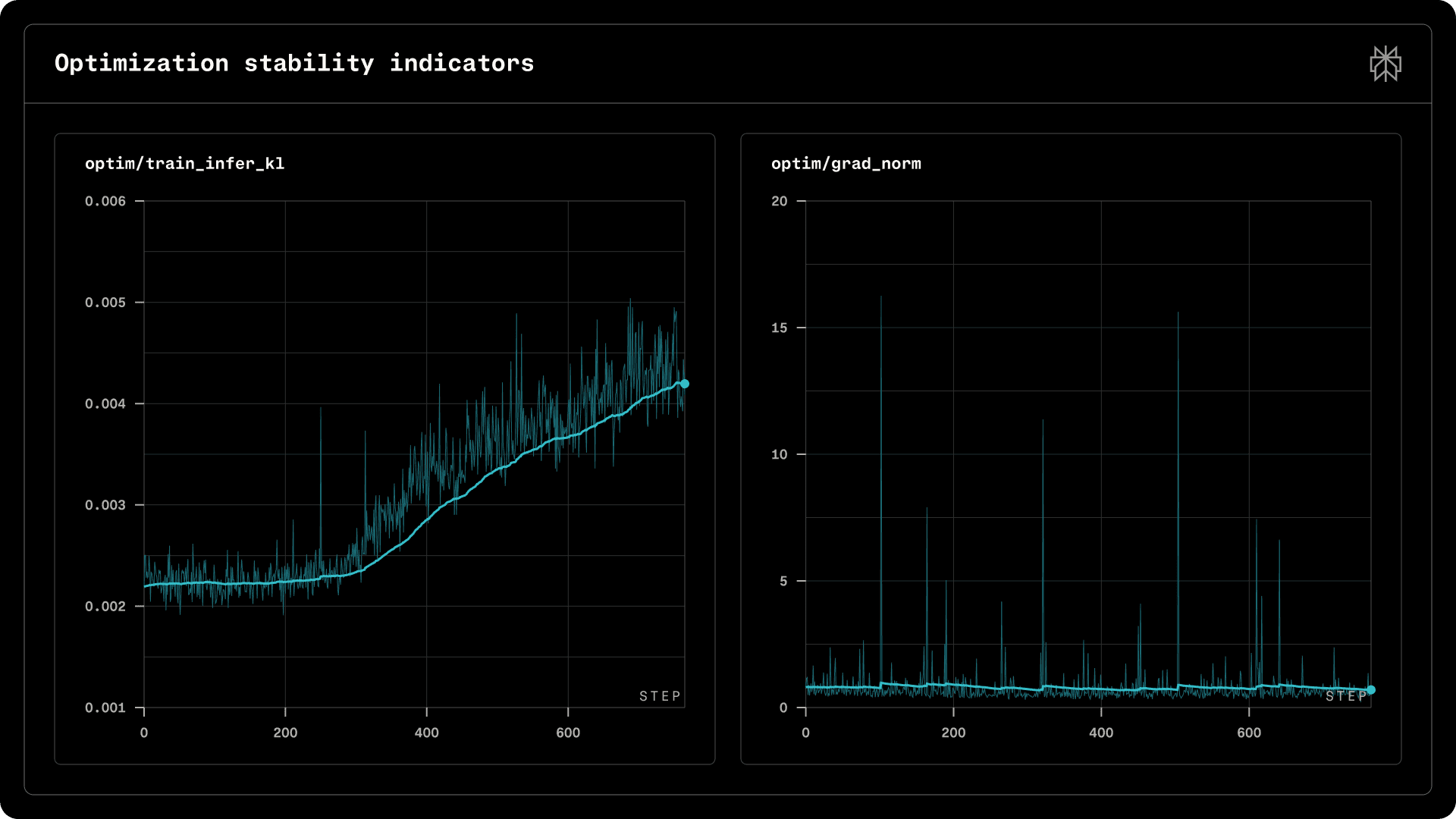 Figure 4 shows that gradient norms remain stable aside from transient spikes, while the training-inference KL divergence exhibits a mild upward trend, staying within the 1e-3 scale. This drift pattern is consistent with observations in other RL training frameworks; as training remains stable throughout, we retain a simple IS regularization in Eq. 1 without additional intervention.