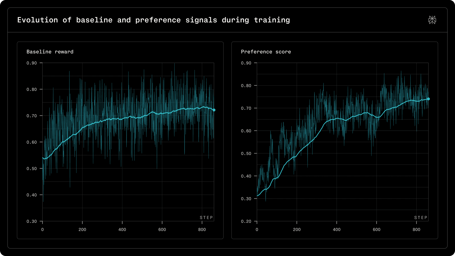 Training data for preference modeling is drawn from curated open-source datasets, user side-by-side feedback, and internal annotations. To address label noise, we apply a lightweight filtering and calibration pipeline inspired by Datbench (DatologyAI, 2026), retaining only examples with consistent cross-model agreement. The reward model shares the same backbone as the policy model, with the language modeling head replaced by a value head. While smaller reward models achieve comparable held-out accuracy, we find empirically that they fail to capture fine-grained preferences and can reinforce undesirable policy behaviors.