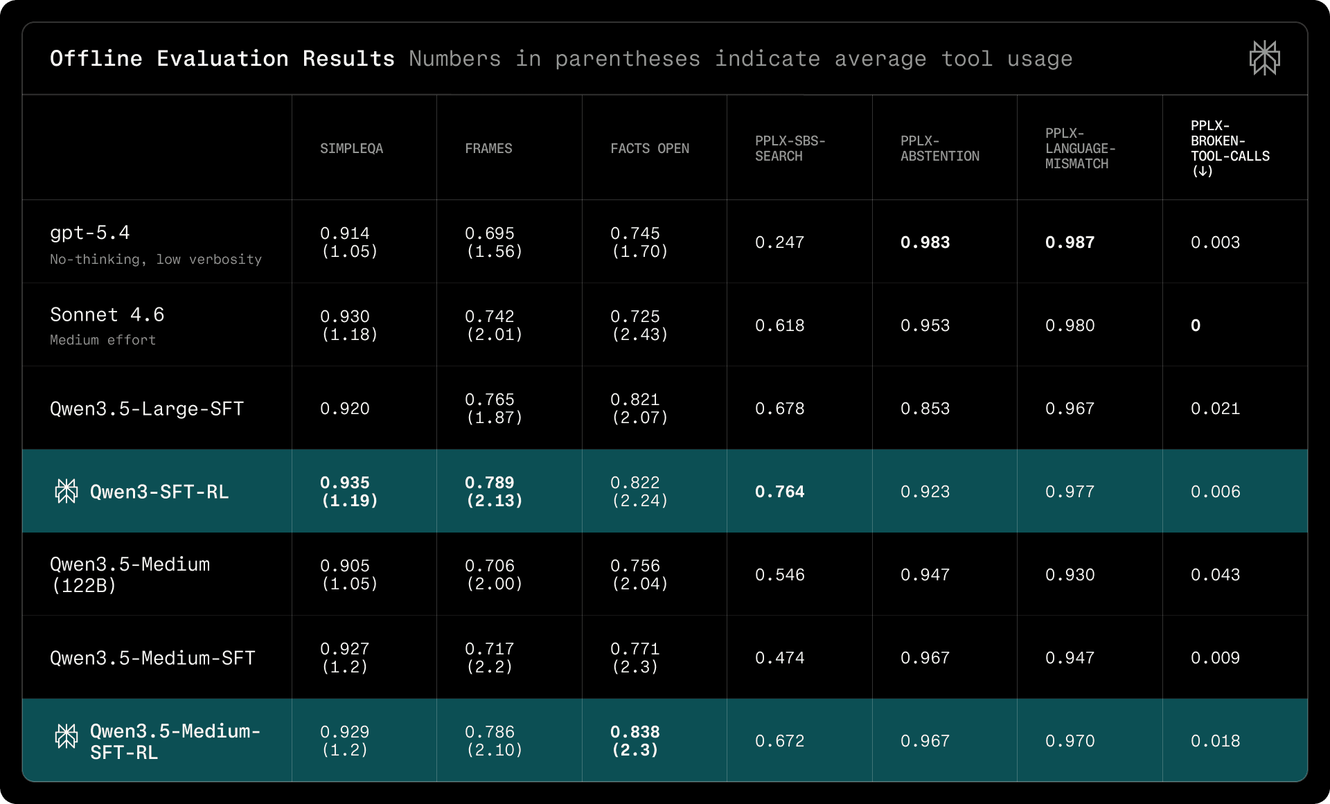 We report results on a suite of benchmarks spanning search accuracy, factual reliability, instruction following, and safety, comprising both public benchmarks and internal Perplexity (PPLX) metrics. Public benchmarks include SimpleQA, FRAMES, and Facts Open.
