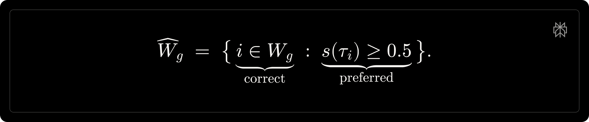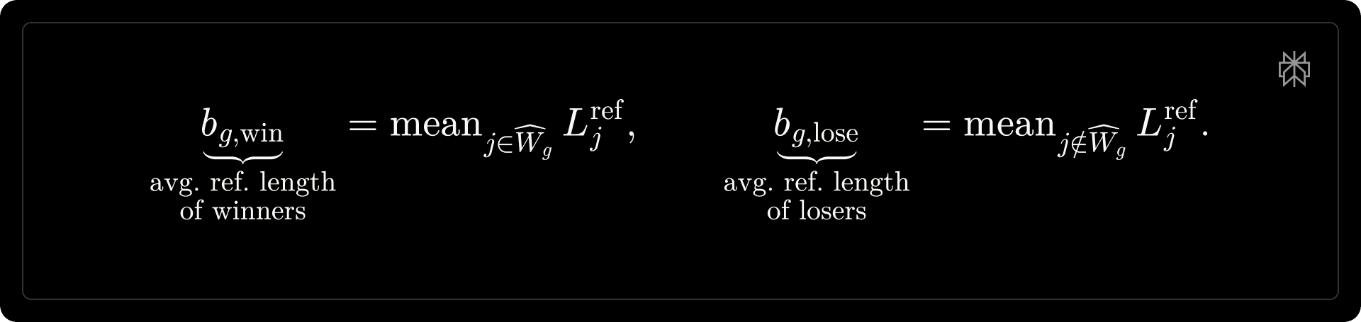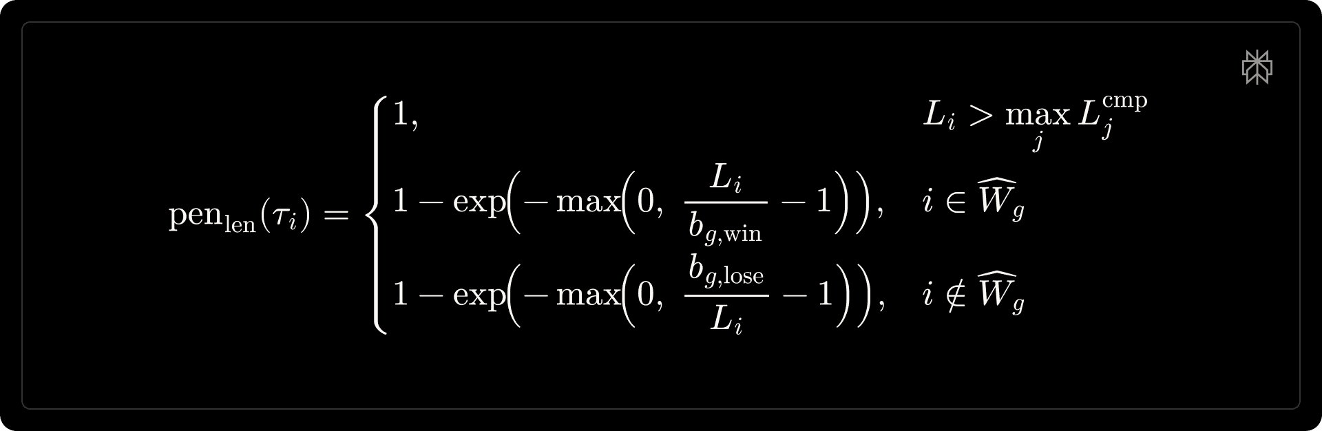 Anchored length penalty. Let [math]L_i[/math] and [math]L_i^{\mathrm{ref}}[/math] denote the token lengths of the candidate and reference model generations, respectively. We define the shaping set [math]\widehat{W}_g[/math] as rollouts that are both correct and preferred: