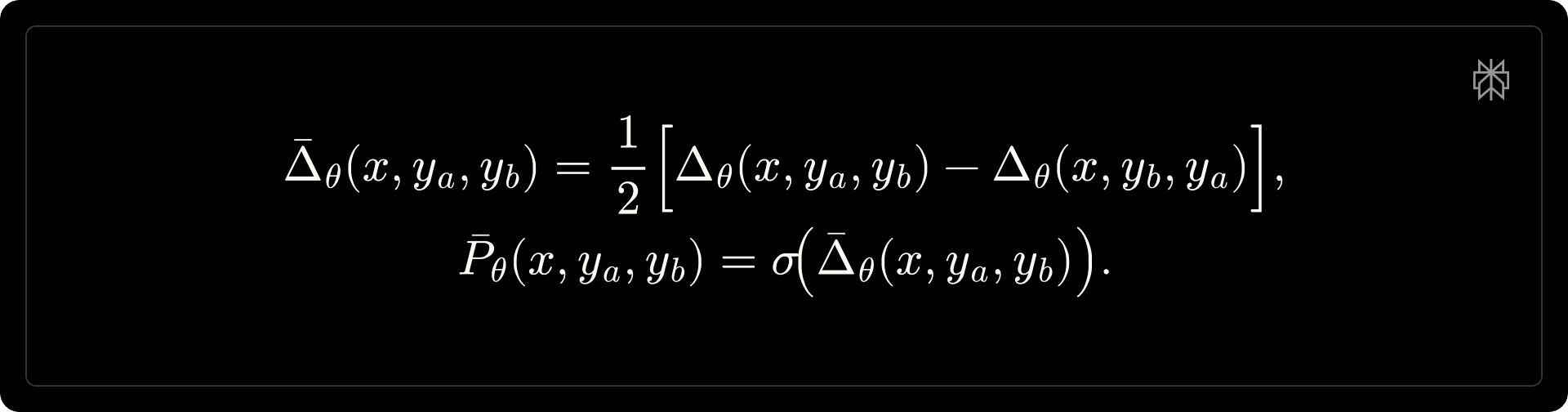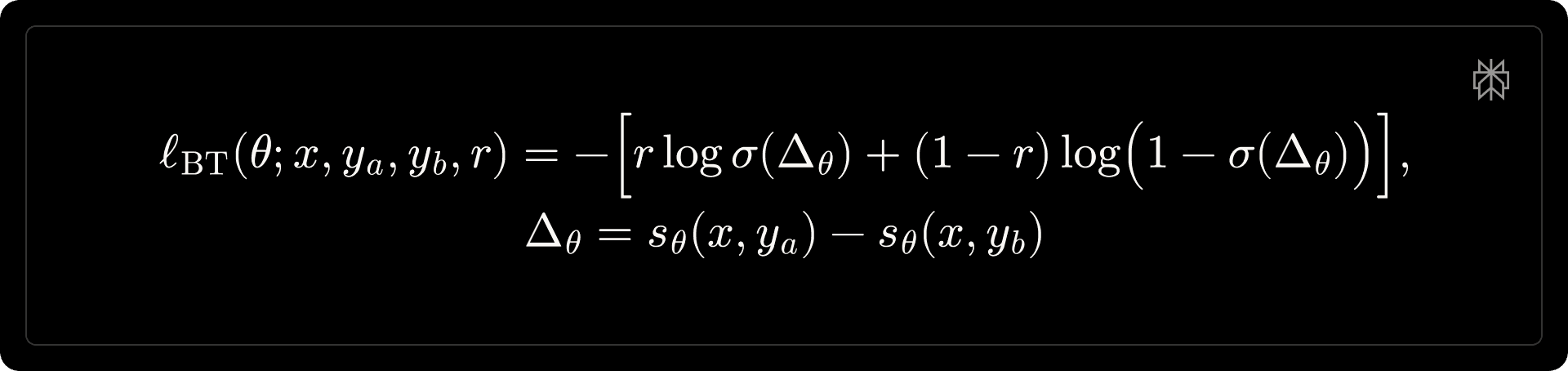 We formulate preference learning under the Bradley–Terry framework. Given a context [math]x[/math] and two candidate responses [math]y_a, y_b[/math], the model produces scalar scores [math]s_{\theta}(x, y) \in \mathbb{R}[/math] and minimizes,