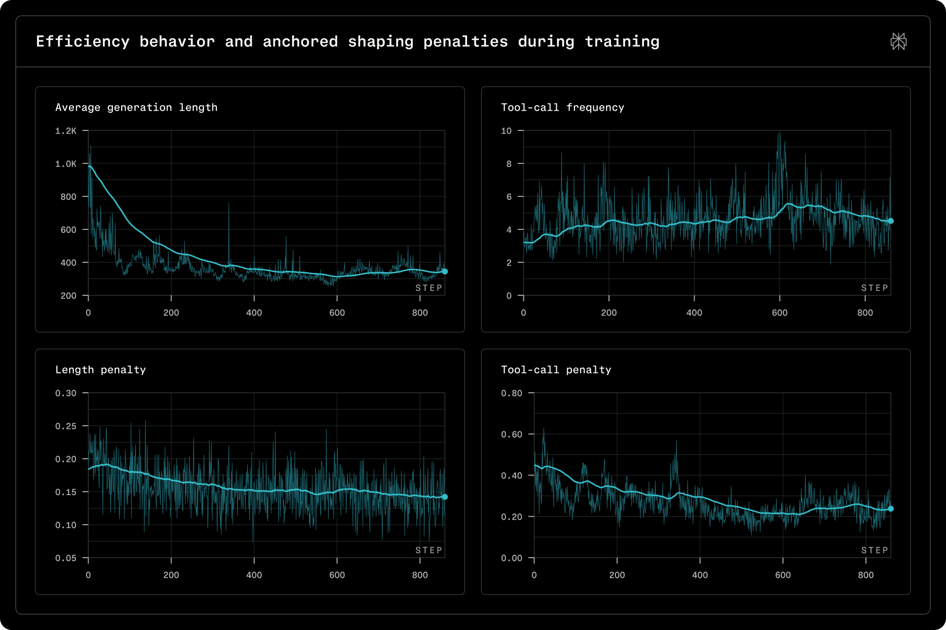 Figure 3 demonstrates that both tool-call frequency and generation length remain well-controlled throughout training. Notably, both the tool-call and length penalties decrease monotonically over the course of training, reflecting the model’s progressive adaptation toward more concise generation and more selective tool invocation.