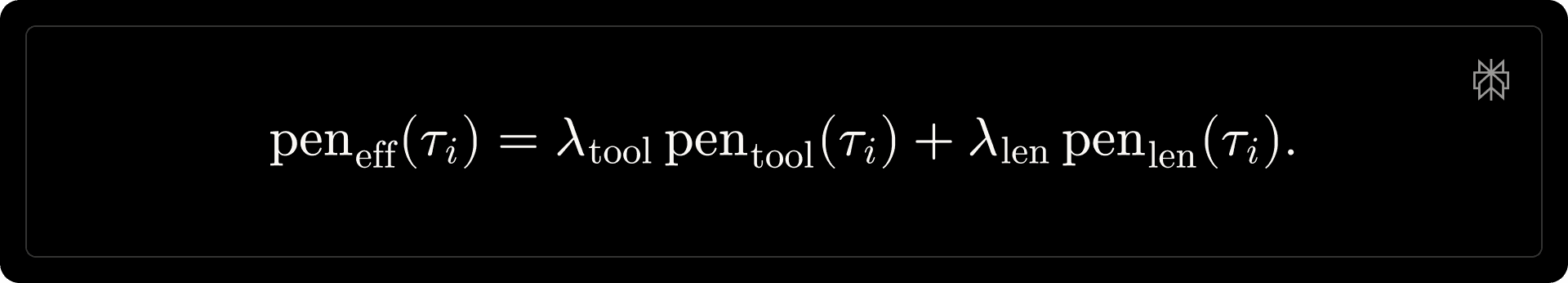 Anchored tool-call penalty. For each rollout [math]\tau_i[/math], let [math]c_i[/math] denote the number of tool calls and [math]e_i[/math] the number of tool-execution failures. We define the effective tool-call count [math]\tilde{c}_i = c_i - e_i[/math] and uniformly sample a group baseline: