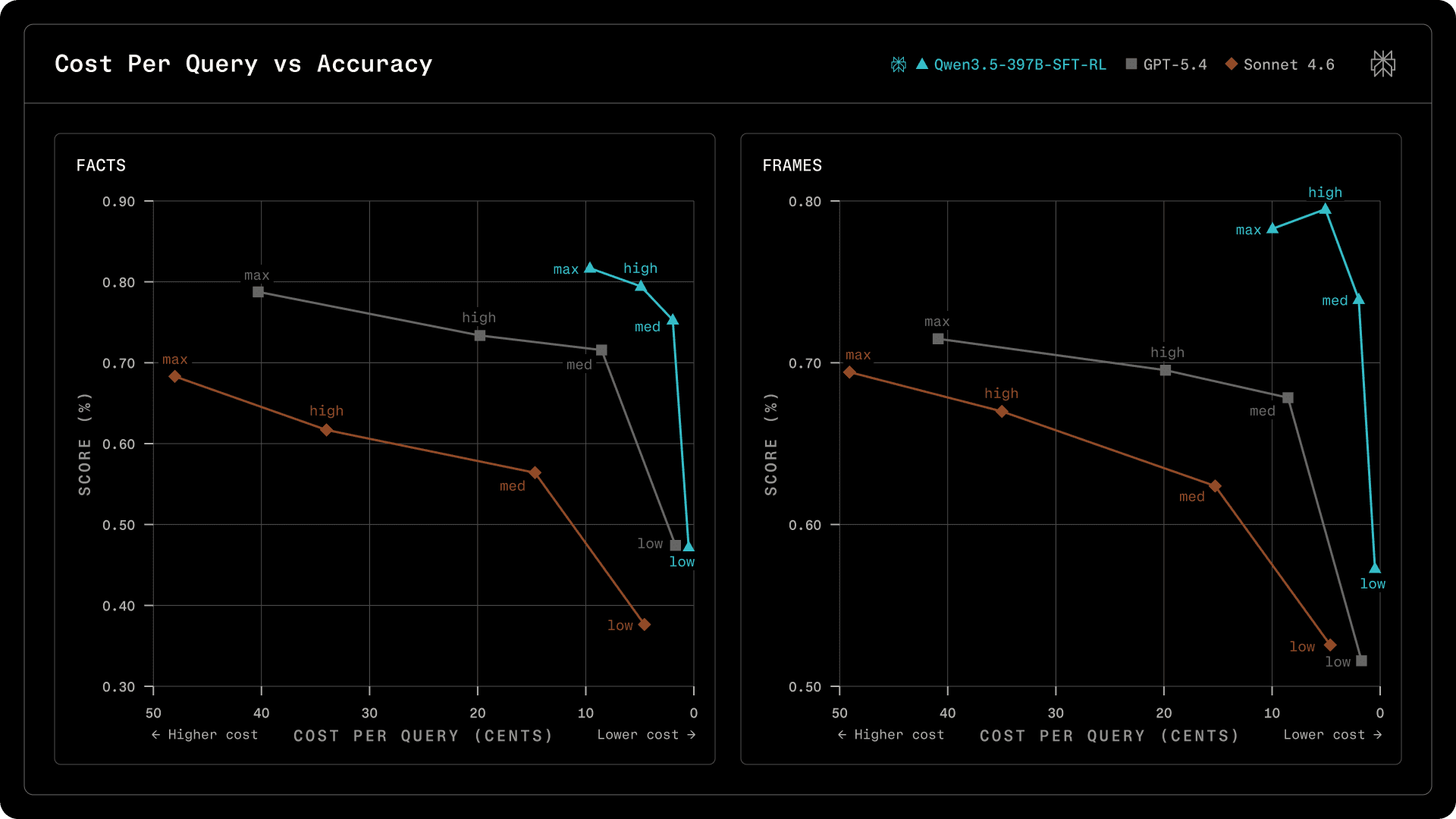 At the medium profile (b=4), Qwen3.5-397B-SFT-RL scores 73.9% on FRAMES at 2.0 cents per query, while GPT-5.4 scores 67.8% at 8.5 cents and Sonnet 4.6 scores 62.4% at 15.3 cents. That is +6 points accuracy at 4x lower cost compared to GPT-5.4, and +11.5 points at 7.5x lower cost compared to Sonnet 4.6.