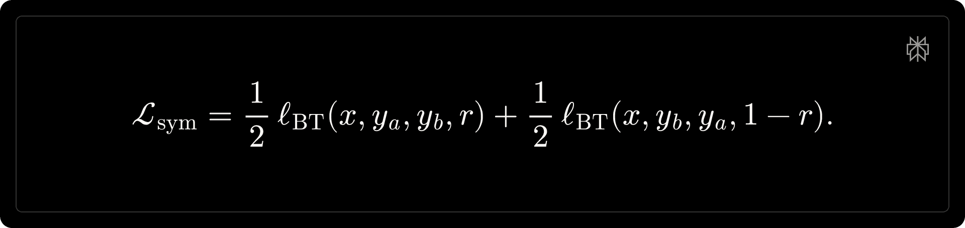 where [math]r \in \{0, 1\}[/math] indicates whether [math]y_a[/math] is preferred. To eliminate positional bias, each training pair is augmented with both orderings and optimized symmetrically,