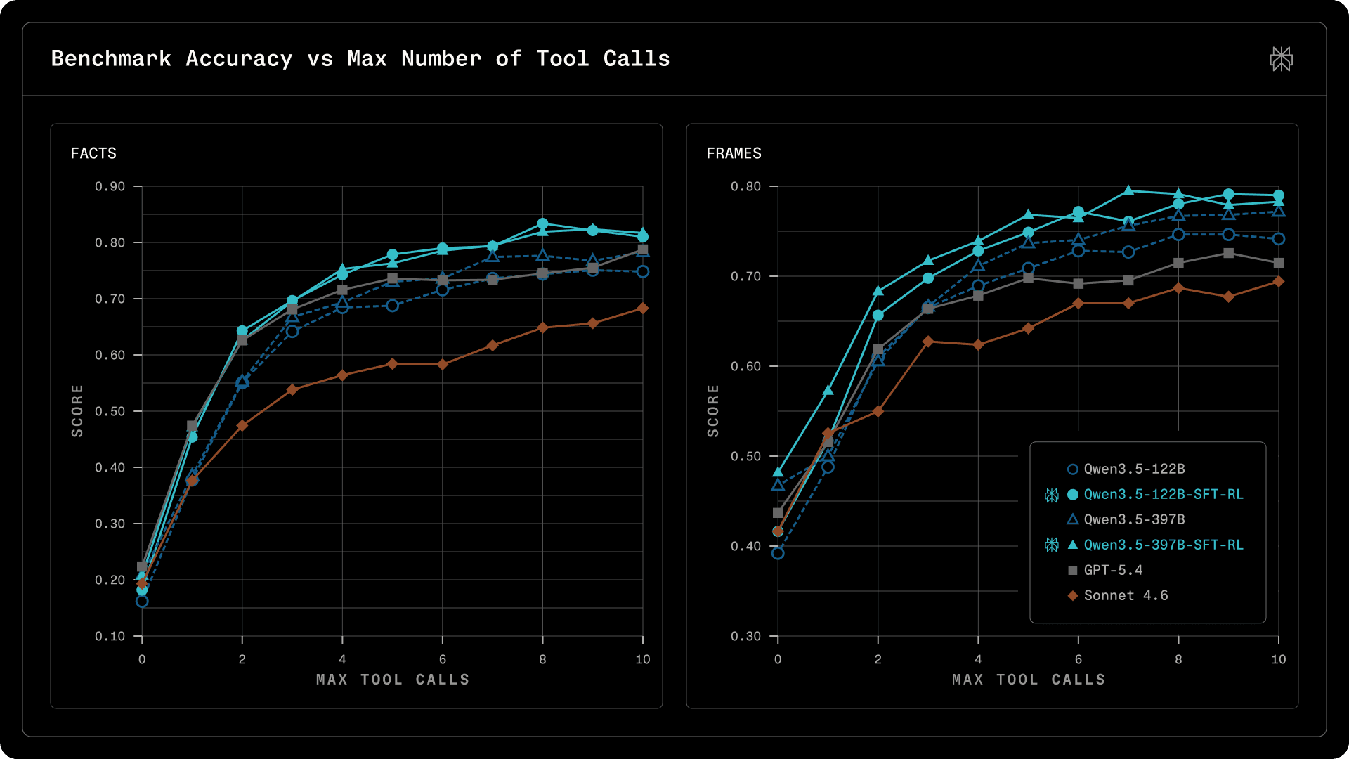 Our post-trained Qwen3.5-397B-SFT-RL achieves the best search accuracy on both benchmarks. Even with a single tool call, it scores 57.3% on FRAMES, 5.7 points above GPT-5.4 and 4.7 points above Sonnet 4.6.