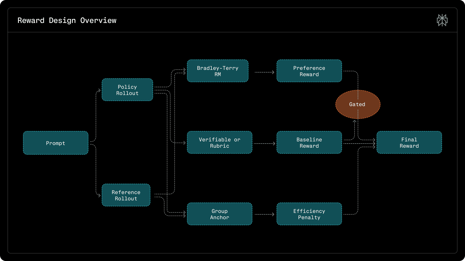Figure 1: Reward design overview. We combine a baseline correctness signal (verifiable/rubric), a Bradley–Terry preference score, and anchored efficiency penalties. Preference is gated by baseline correctness to prevent reward hacking.