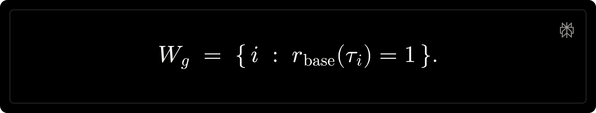 We define a binary baseline signal [math]r_{\mathrm{base}}(\tau_i) \in \{0,1\}[/math] that captures task correctness or instruction compliance. For verifiable search-agent data, [math]r_{\mathrm{base}}(\tau_i)=1[/math] if the final answer matches the ground truth, and [math]0[/math] otherwise. For rubric-based general chat data, [math]r_{\mathrm{base}}(\tau_i)=1[/math] if all rubrics are satisfied, and [math]0[/math] otherwise. This baseline serves as the hard gate in the conditional aggregation rule Eq. 2.
