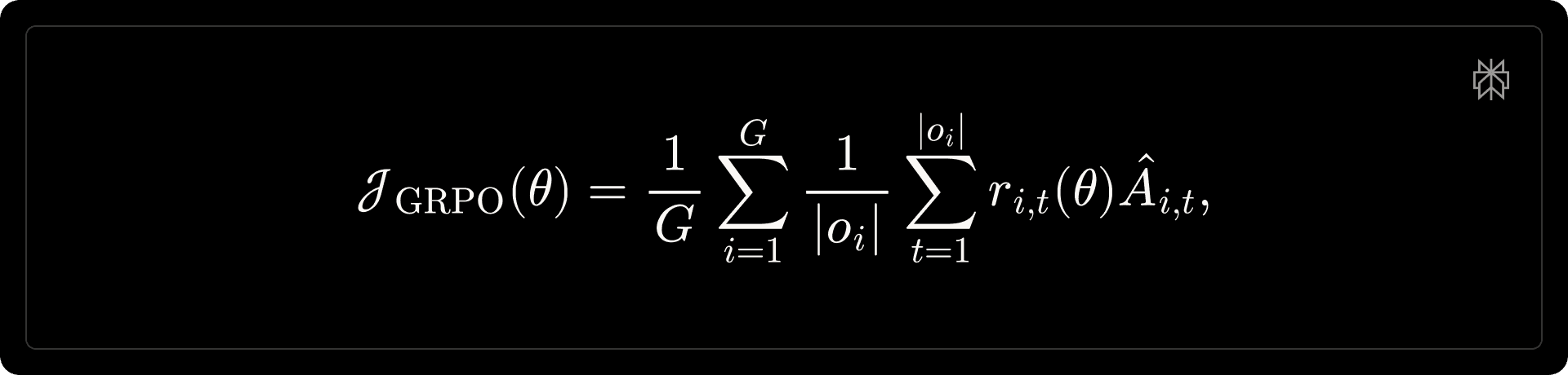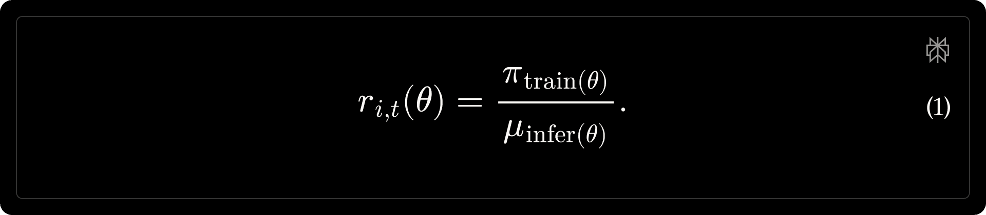 where [math]G[/math] is the size of the group, [math]o_{i}[/math] denotes the [math]i[/math]-th sampled output, and [math]\hat{A}_{i, t} = \hat{A}_{i}[/math] is the advantage. Reward design is detailed in the reward design section; in brief, we combine baseline correctness with preference-based and anchored efficiency shaping. Following prior work (Liu et al., 2025a; Yao et al., 2025; Zheng et al., 2025a), we apply token-level Importance Sampling (IS) to correct for the training–inference mismatch: