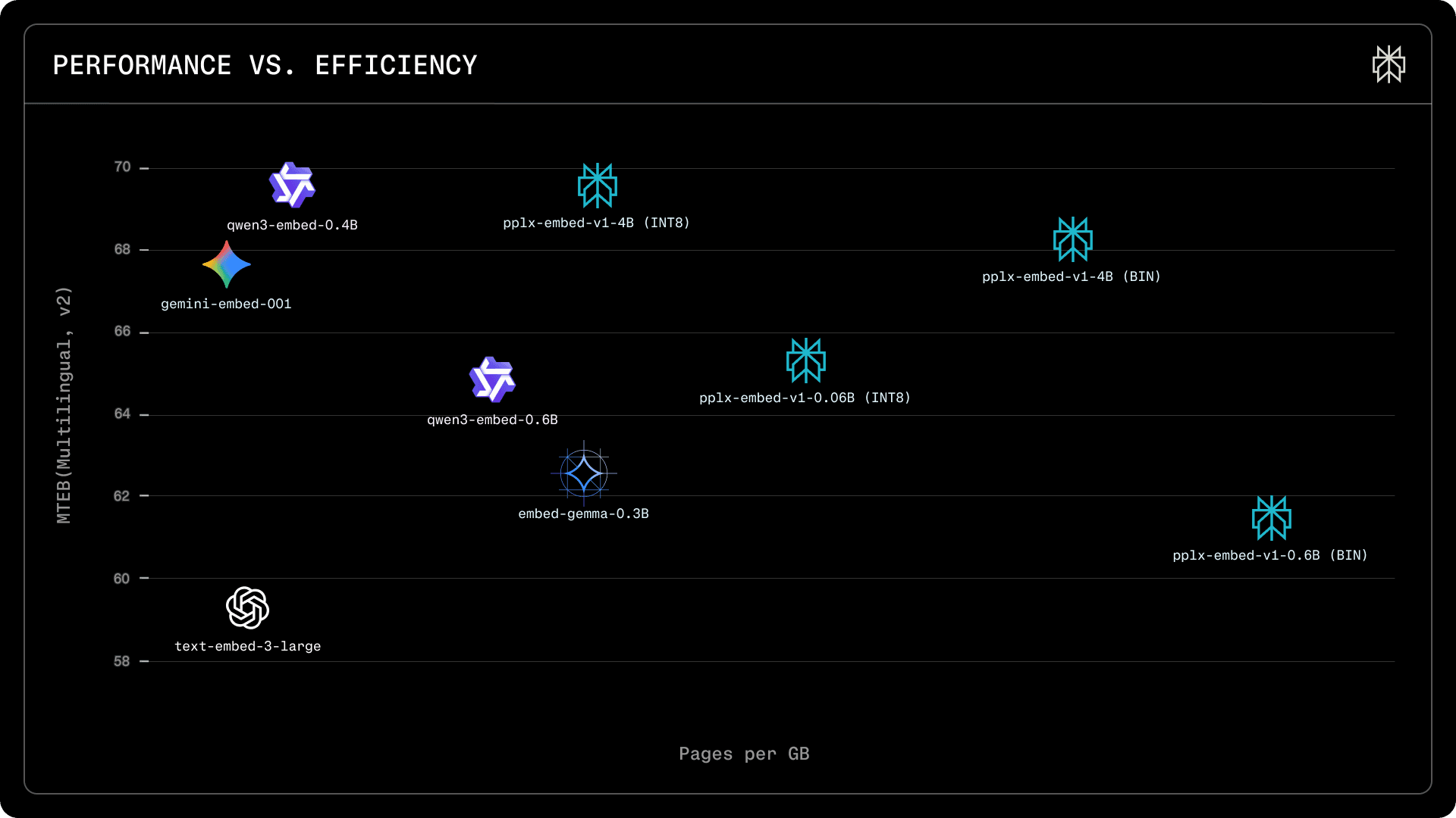 On the MTEB(Multilingual, v2) retrieval benchmark, pplx-embed-v1-4B(INT8) achieves an average nDCG@10 of 69.66%, matching Qwen3-Embedding-4B (69.60%) and exceeding gemini-embedding-001 (67.71%), while requiring substantially less storage per embedding. Our 0.6B model outperforms its Qwen3 counterpart at the same parameter scale.