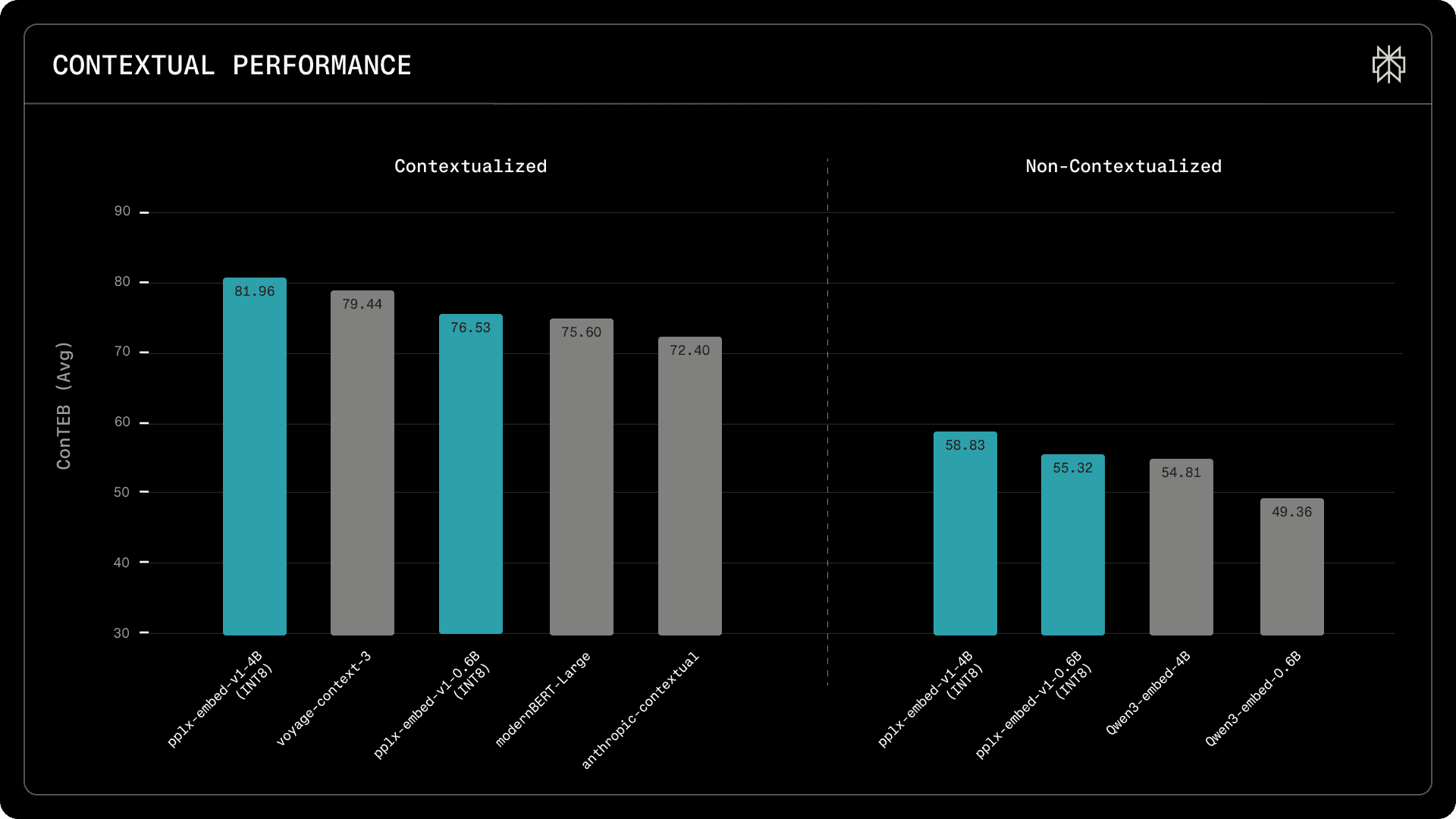 For contextual retrieval, pplx-embed-context-v1-4B sets a new state of the art on the ConTEB benchmark with an average nDCG@10 of 81.96%, outperforming voyage-context-3 (79.45%) and Anthropic Contextual (72.4%). By training chunk-level representations that incorporate document-level semantics, our models retrieve the right passage even when its meaning depends on surrounding context.