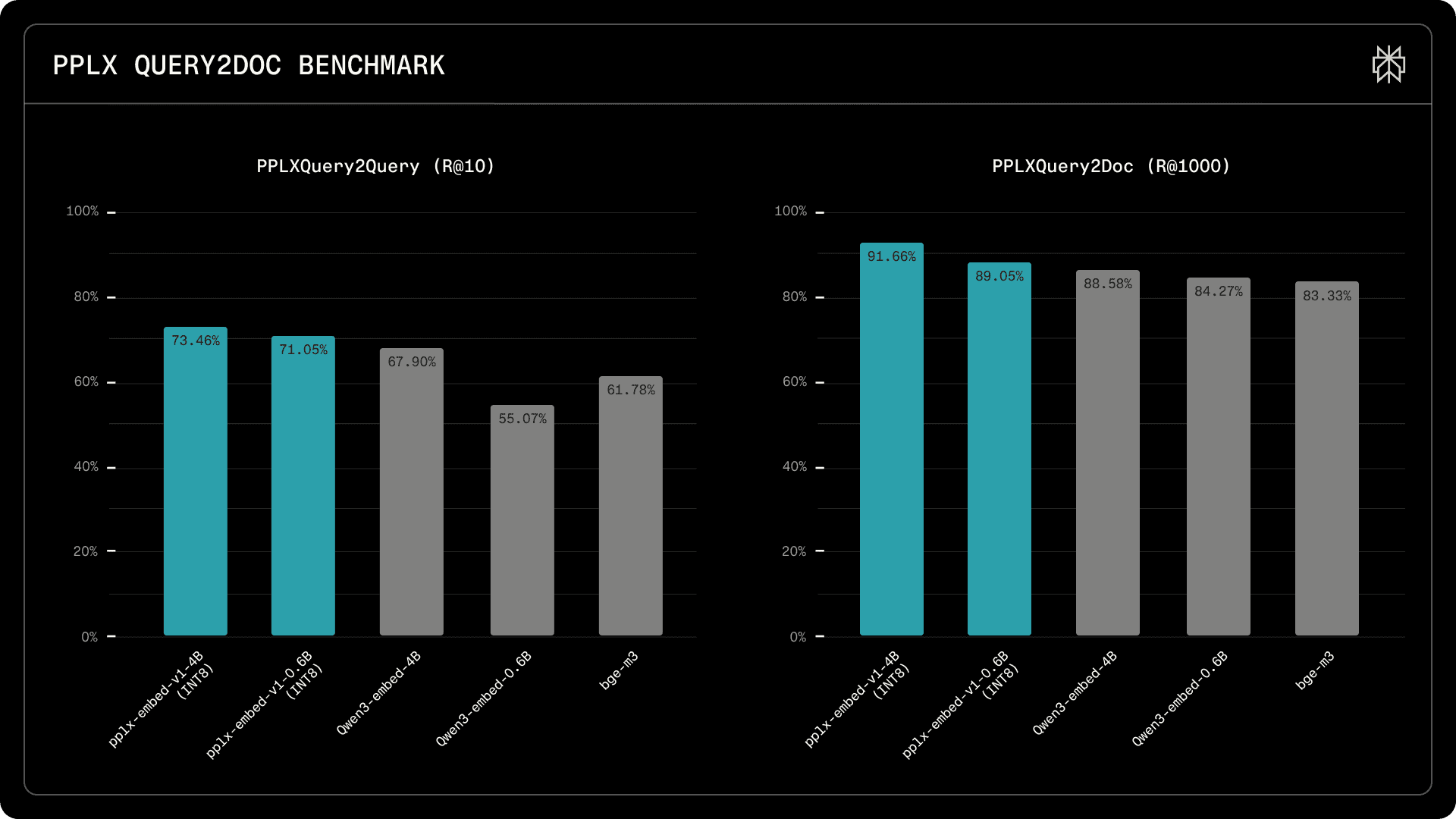 Public benchmarks are useful, but they don’t fully capture web-scale retrieval challenges: long-tail queries, noisy documents, and distribution shifts that characterize production environments. To measure what matters in practice, we built two internal benchmarks with up to 115K real-world queries evaluated against more than 30 million documents pooled from over 1 billion web pages. PPLXQuery2Query evaluates whether an embedding model can identify semantically equivalent queries from real search traffic; PPLXQuery2Doc measures document retrieval from a 30M-page corpus.